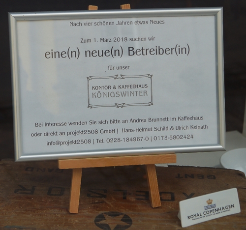 Für das Kontor & Kaffeehaus in der Hauptstraße 424 (Ecke Bungertstraße) wird noch ein neuer Betreiber / eine neue Betreiberin gesucht. Es wäre zu-zu-schade, wenn dieses herrliche Ladenlokal nicht noch in diesem Sommer zu seiner Bestimmung zurückfände.