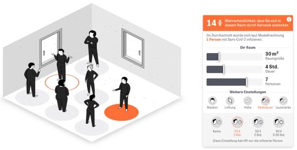 Das Modell schätzt eine individuelle Wahrscheinlichkeit, die in der Realität aber starken Schwankungen unterliegt. Denn einige Parameter, die in dieser Berechnung als Konstante eingehen, variieren in realen Szenarien. Dazu gehört die individuelle Viruslast einer infektiösen Person oder auch die Anzahl an infektiösen Partikeln, die es braucht, um eine gesunde Person anzustecken. Zudem geht das Modell davon aus, dass sich die Personen an einem Mindestabstand von 1,5 Metern halten. Die Modellrechnung soll primär zeigen, wie sich veränderte Parameter, etwa vermehrtes Lüften oder Maske tragen, auf das individuelle Infektionsrisiko auswirken.